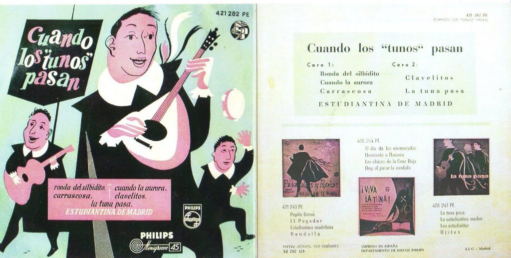 El NO-DO 217 A de 3 de Marzo de 1947 contempla a la Estudiantina del S.E.U. saliendo de la Universidad Central en la calle de San Bernardo y desfilando por la Gran Vía Madrileña. Lamentablemente el audio original o está deteriorado o se ha perdido y en su lugar he puesto las notas de La Ventera de Alcalá de R.Calleja y P. Luna, interpretadas por la Orquesta de Pulso y Púa de la Universidad Complutense que pertenece a su CD “Caminos sin fronteras” del 2004.